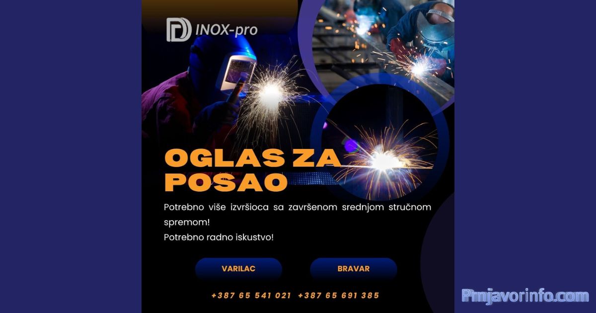Kompanija DD INOX-pro, poznata po visokokvalitetnoj proizvodnji i obradi metala, objavila je oglas za zapošljavanje većeg broja radnika zbog povećanog obima posla. Potrebni su izvršioci sa završenom srednjom stručnom spremom i prethodnim radnim iskustvom na sljedećim pozicijama: VARILACBRAVAR Zainteresovani kandidati mogu se javiti na sljedeće brojeve telefona:+387 65 541 021+387 65 691 385 Ukoliko imate […]