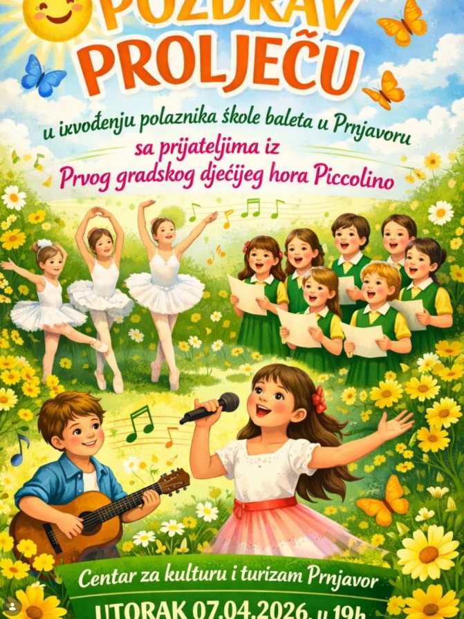 U Centar za kulturu i turizam Prnjavor u utorak, 7. aprila, biće održan program pod nazivom „Pozdrav proljeću“, u kojem će nastupiti polaznici škole baleta u Prnjavoru zajedno sa prijateljima iz Prvi gradski dječiji hor Piccolino.