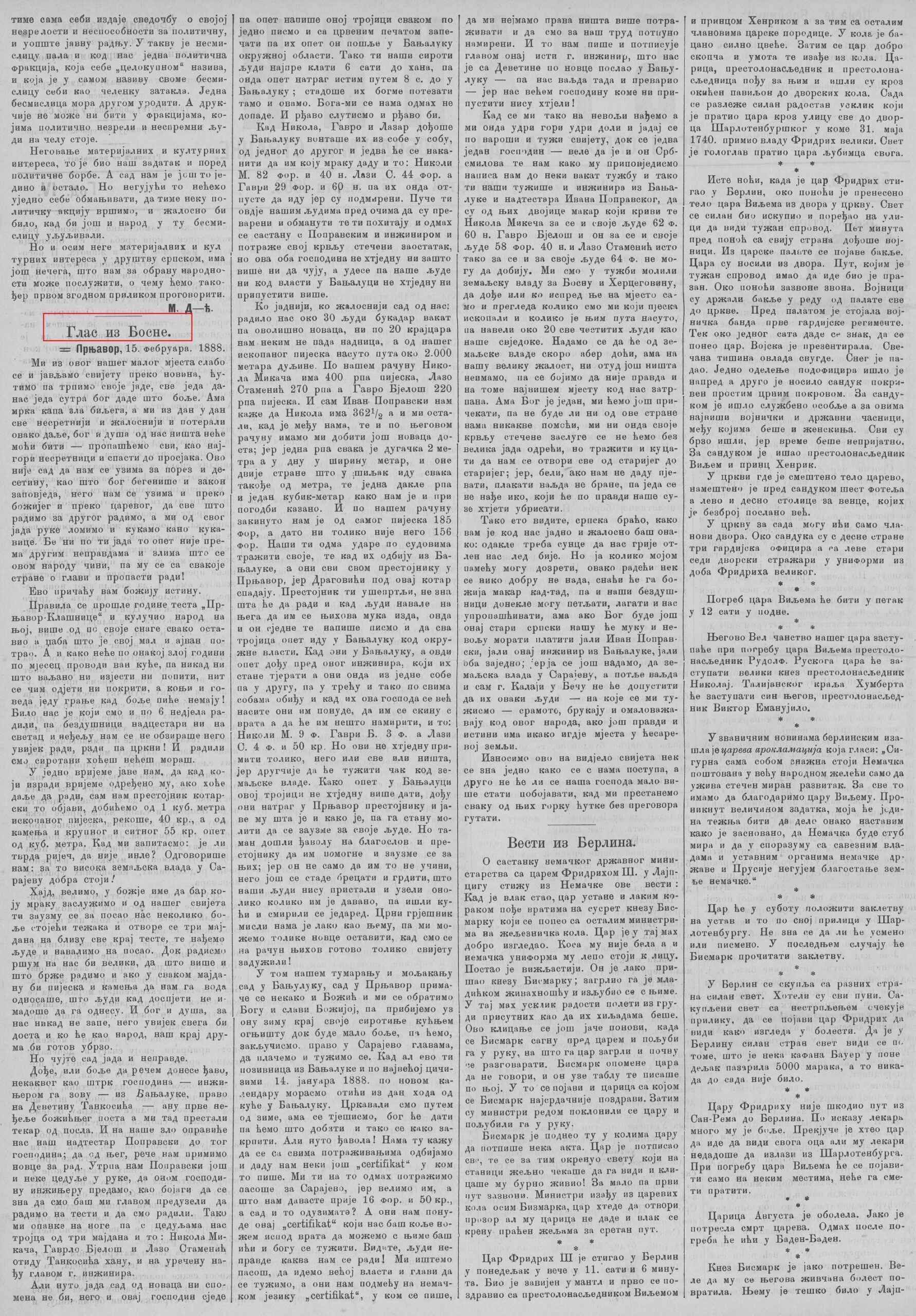 У наставку доносимо комплетан текст објављен 15. фебруара 1888. године, без скраћивања.