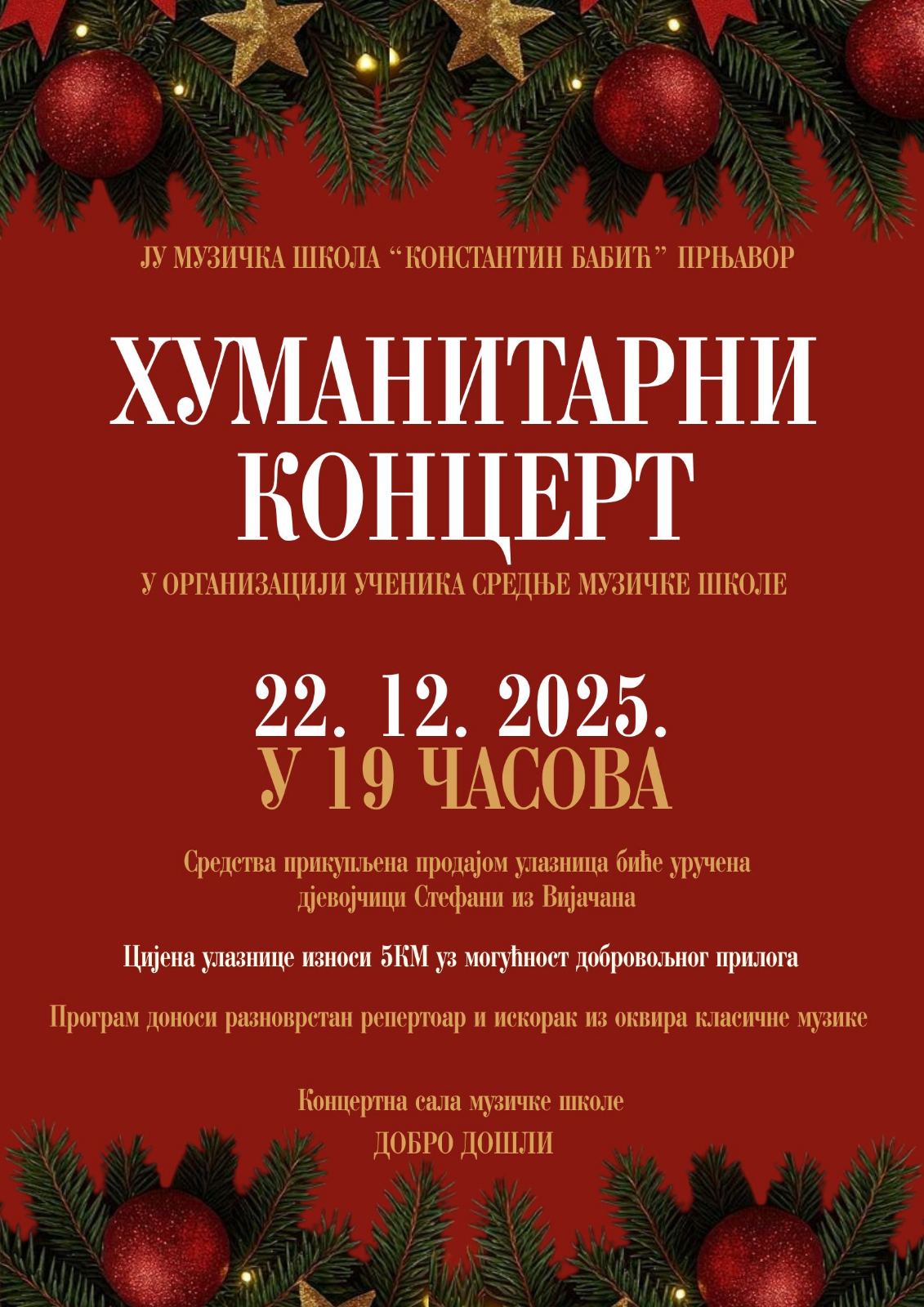 Концерт ће бити одржан у понедељак, 22. децембра 2025. године, са почетком у 19 часова, у концертној сали Музичке школе.