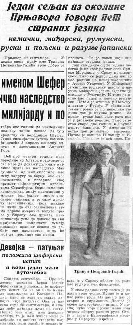 Prnjavor, 27 septembra 1936. godina. — U celom ovom kraju ime Trivun Petković-Gajić vrlo dobro je poznato. To je čovek koji zna najviše stranih jezika.