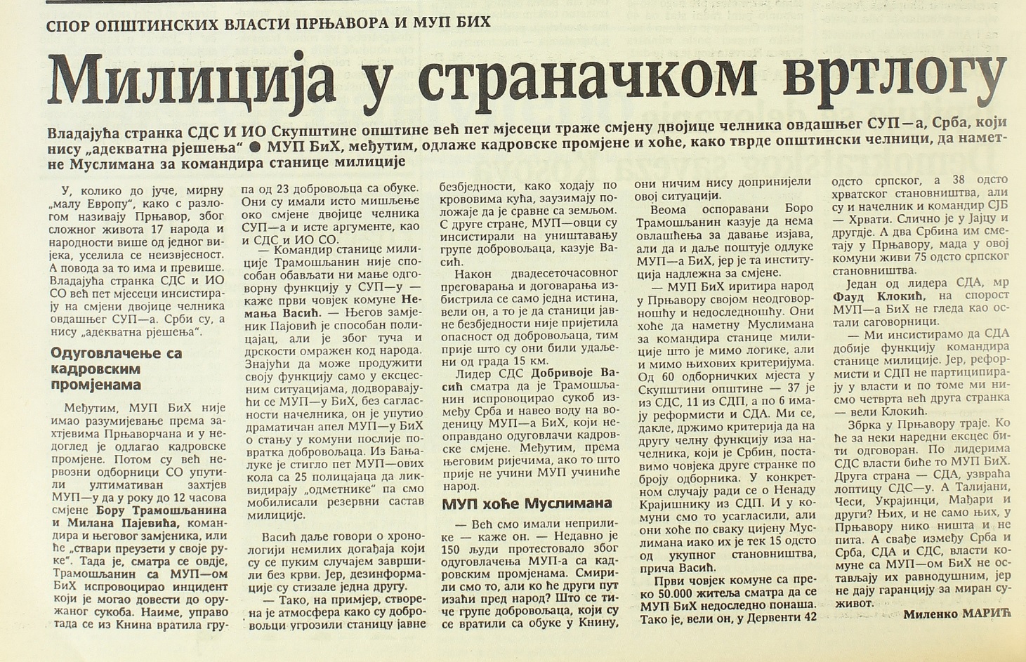„MUP BiH iritira narod u Prnjavoru svojom neodgovornošću i nedosljednošću. Oni hoće da nametnu Muslimana za komandira stanice milicije što je mimo logike, ali i mimo njihovih kriterijuma. Od 60 odborničkih mjesta u Skupštini opštine, 37 je iz SDS-a, 11 iz SDP-a, a po 6 imaju reformisti i SDA. Mi se, dakle, držimo kriterijuma da na drugu čelnu funkciju iza načelnika, koji je Srbin, postavimo čovjeka druge stranke po broju odbornika. U konkretnom slučaju radi se o Nenadu Krajišniku iz SDP-a. I u komuni smo to usaglasili, ali oni hoće po svaku cijenu Muslimana iako ih je tek 15 odsto od ukupnog stanovništva“, priča Vasić.