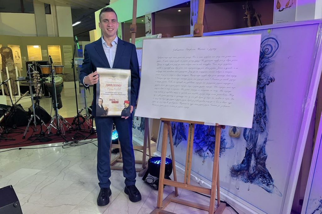 Kako ističe, ovo nije prva nagrada za njegov trud i rad, već je osvojio prvo mjesto na konkursu za najljepši ćirilički rukopis “Jezik naš nasušni”, kao i bronzano pero za rukopisnu izuzetnost na konkursu “Moja olovka piše ćirilicom”.