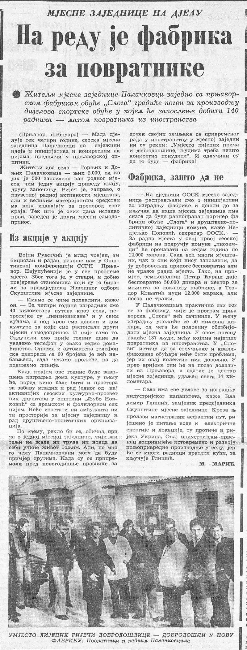 U dnevnom listu Borba od 18. februara 1980. godine objavljena je reportaža o ambicioznoj inicijativi stanovnika Palačkovaca kod Prnjavora. U saradnji sa tadašnjom prnjavorskom fabrikom obuće „Sloga“, planirana je izgradnja pogona za proizvodnju dijelova sportske obuće koji je trebalo da zaposli više od 140 radnika, uglavnom povratnika iz inostranstva.