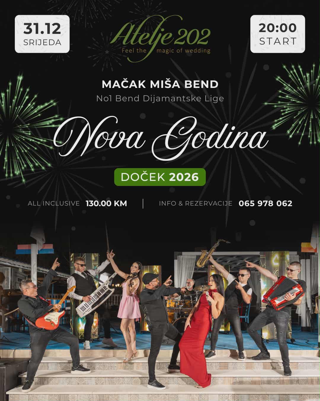 Atelje 202 priprema jedan od najatraktivnijih dočeka Nove godine u regionu! U nezaboravnoj novogodišnjoj noći, u srijedu 31. decembra, goste će zabavljati Mačak Miša bend, jedan od najtraženijih i najpopularnijih bendova Dijamantske lige.
