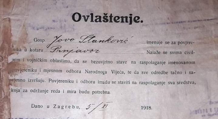 Документ представља Овлаштење на име прњаворског трговца Јове Станковића, којим се он именује за повјереника Котара прњаворског од стране Народног вијећа Словенаца, Хрвата и Срба, а издан је у Загребу 5. новембра 1918. године. Документ је значајан јер садржи и печат Народног вијећа Босне и Херцеговине.