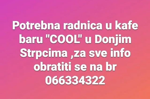 Potrebna radnica u kafe baru “COOL” u Donjim Štrpcima. Sve informacije na broj telefona 066/334-322. Prnjavorinfo.com