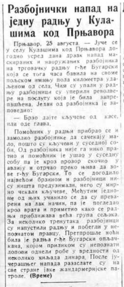 Prnjavor, 25 avgusta. — Juče se u selu Kulašima kod Prnjavora dogodio usred dana drzak napad maskiranih i naoružanih razbojnika na trgovačku radnju g-đe Bugarske koja se toga časa bavila na svome poljskom imanju pola kilometra udaljenom od sela. Čim su upali u radnju razbojnici su uperili revolvere na poslugu koja je bila zaplašena. Jedan od razbojnika je zapovedio: