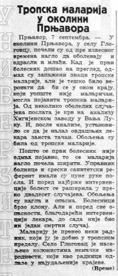 Prnjavor, 7 septembra. — U okolini Prnjavora, u selu Glogovcu, počeli su od pre izvjesnog vremena naglo da obolevaju i odrasli i mlađi. Kad je prvi bolesnik došao na pregled, odmah su zapaženi znaci tropske malarije, ali je teško bilo verovati da bi se u ovom kraju, koji uopšte nije malaričan, mogla pojaviti tropska malarija. Od nekoliko obolelih slučajeva poslata je krv na analizu Higijenskom zavodu u Banja Luci. I, posle analize, ustanovljeno se da je nalaz ovdašnjih lekara zaista tačan. Oboleha su bila od tropske malarije.