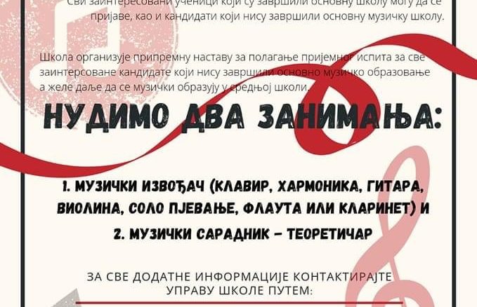 🎼 Zanima te kultura i umjetnost, kreativan si i posjeduješ talenat za muziku, želiš da se usavršavaš u podsticajnoj sredini, da stičeš nova znanja i razvijaš muzičke vještine u savremenom i prijatnom ambijentu uz pomoć odličnog nastavnog kadra, da stičeš interesantna iskustva i prijateljstva, da budeš dio tima koji učestvuje na brojnim kulturnim događajima i takmičenjima republičkog i međunarodnog karaktera, srednja muzička škola je pravi izbor za tebe!